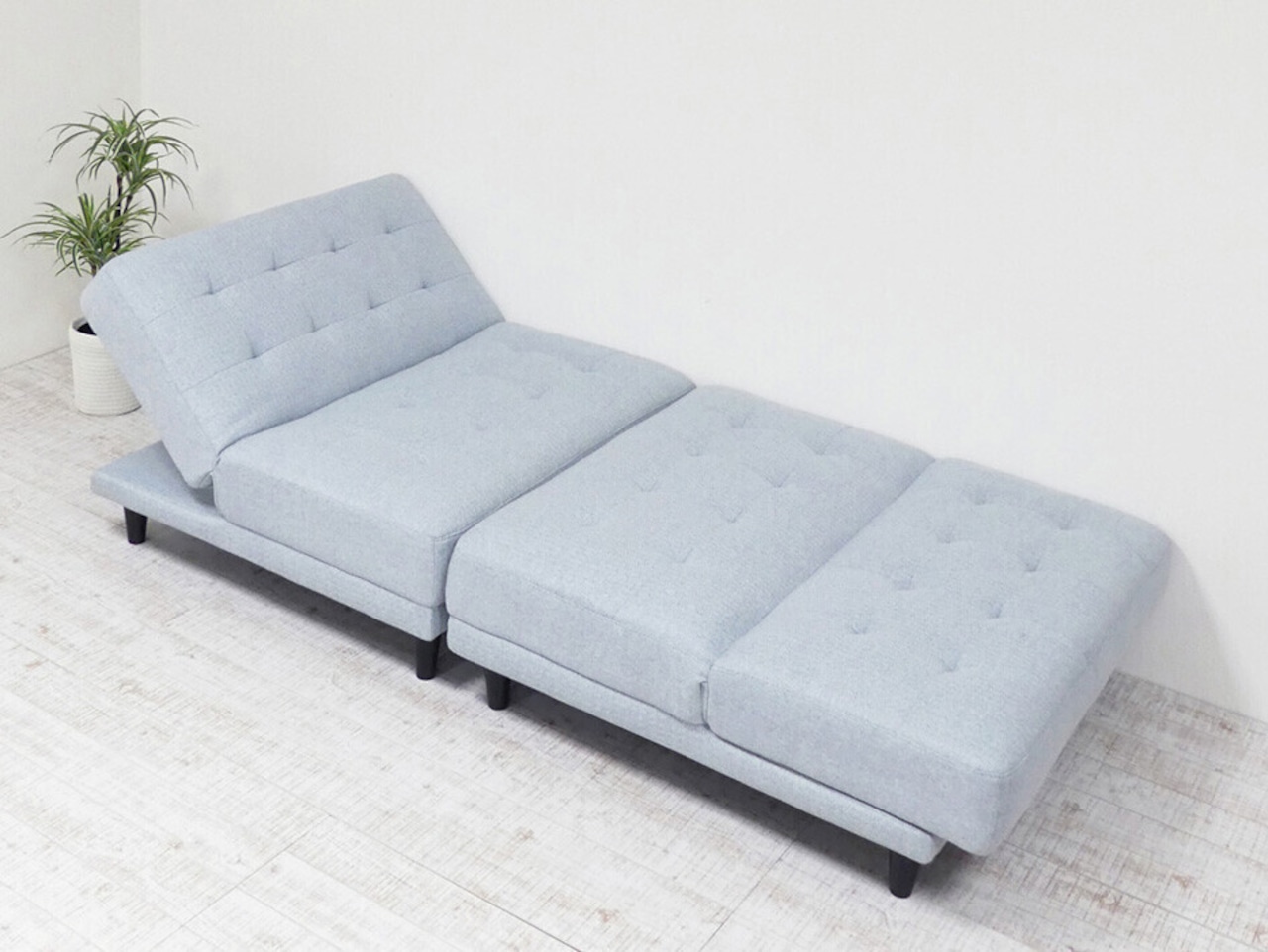 ライトブルーが映える!女性の一人暮らしに重宝する1台3役ソファベッド。固めのベッドで座り心地、寝心地も最高!