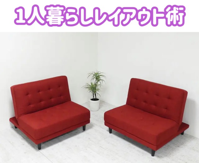 赤が映える1台3役のファブリックの女性の一人暮らしに重宝するソファベッド。固めのベッドで座り心地、寝心地も最高!