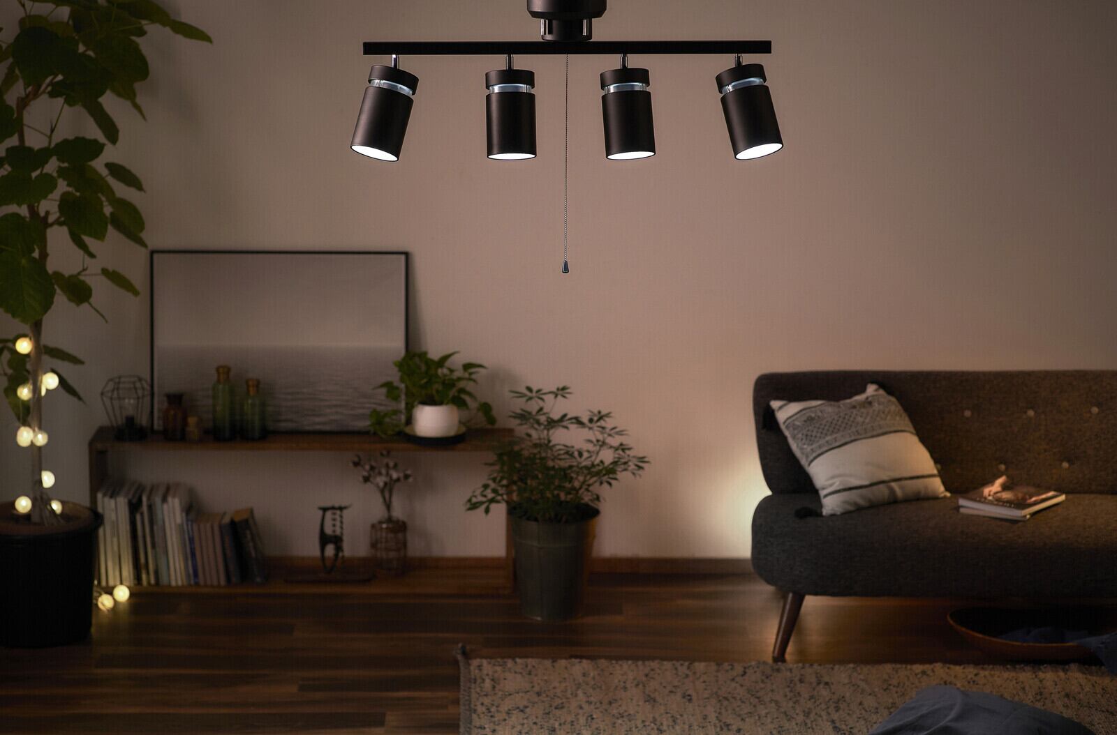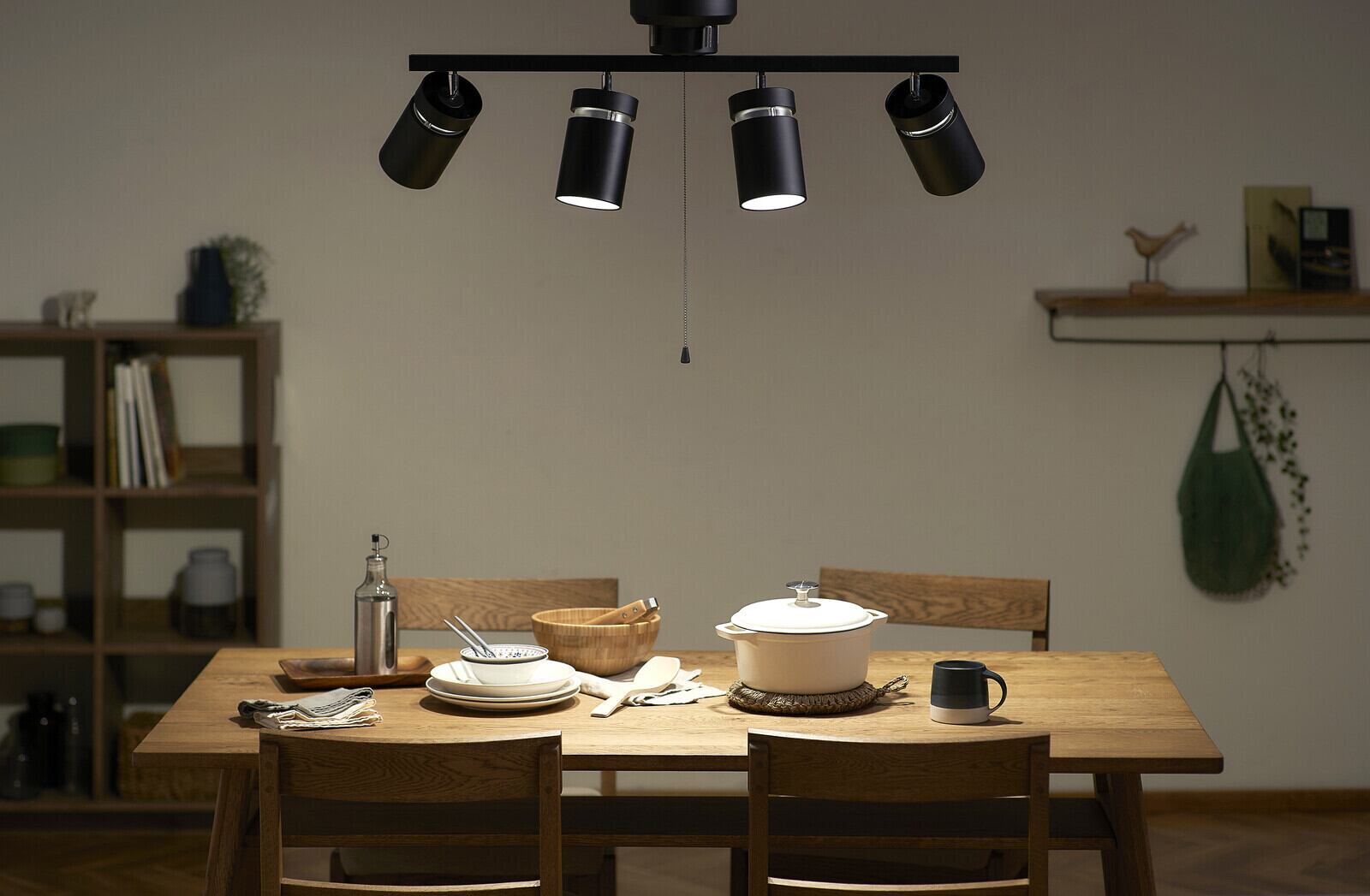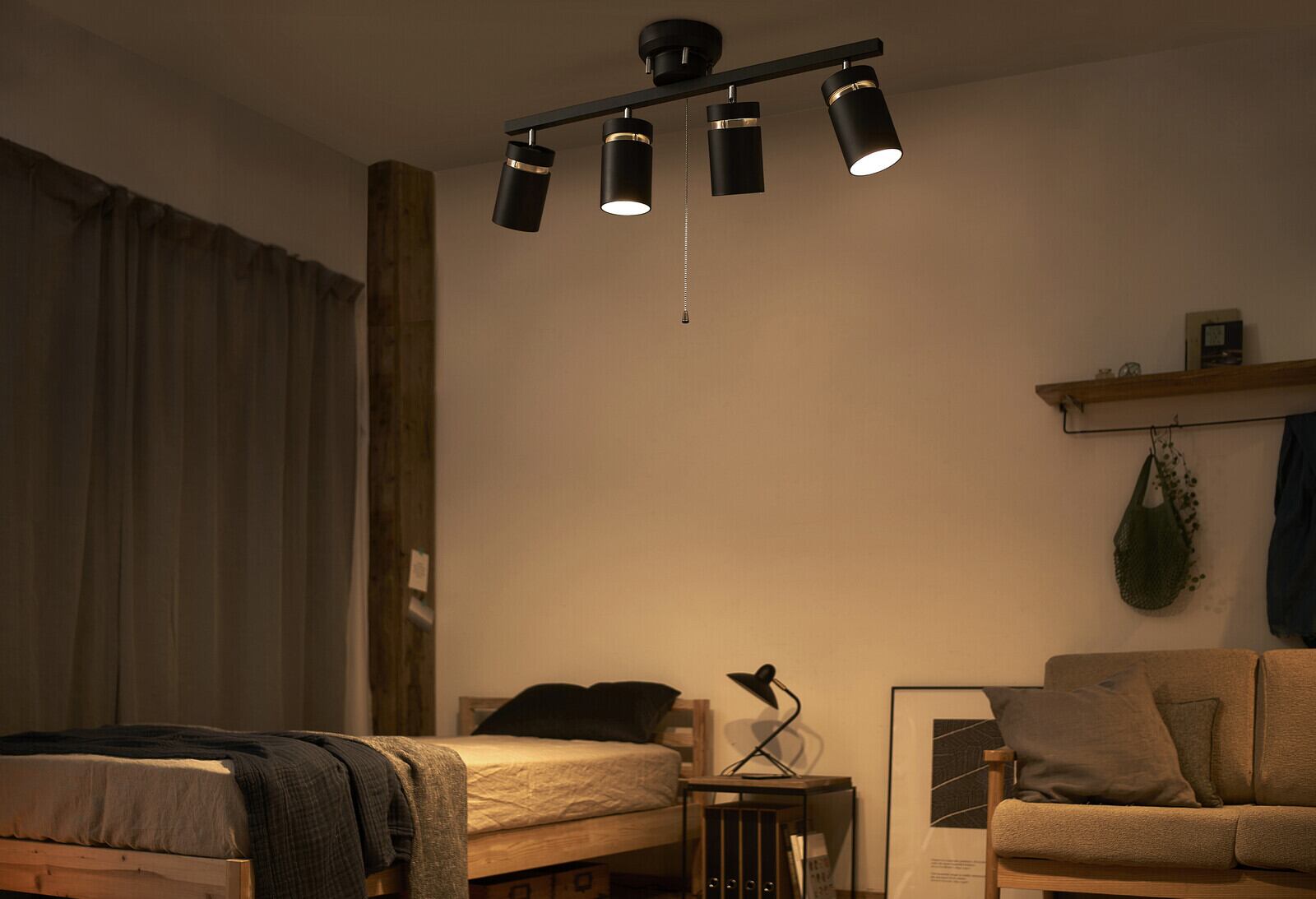1灯ずつ角度が調整可能で、家具などに当てることで、より立体感のある印象を与える4灯シーリングライトです。