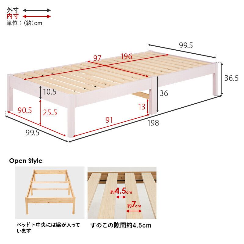 ベッド:(約)幅99.5×奥行198×高さ36.5×床面高36cm
